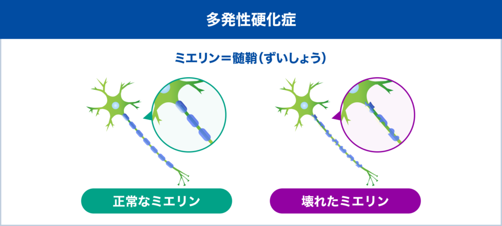 ◆身体の免疫機能が過剰になって、脳や脊髄、視神経の機能が障害される病気です。神経細胞は一本の長い突起をもち(軸索といいます)、突起の中を電気信号が伝わります。軸索内の電気信号を早く伝えるために絶縁体として働いているのが髄鞘(ずいしょう;ミエリンといいます)です。多発性硬化症(略してMSと呼ばれます)は髄鞘がダメージを受ける(脱髄といいます)ことで、神経の信号伝達が障害されて様々な症状が出現します。難病に指定されています(多発性硬化症/視神経脊髄炎(指定難病13) – 難病情報センター)。