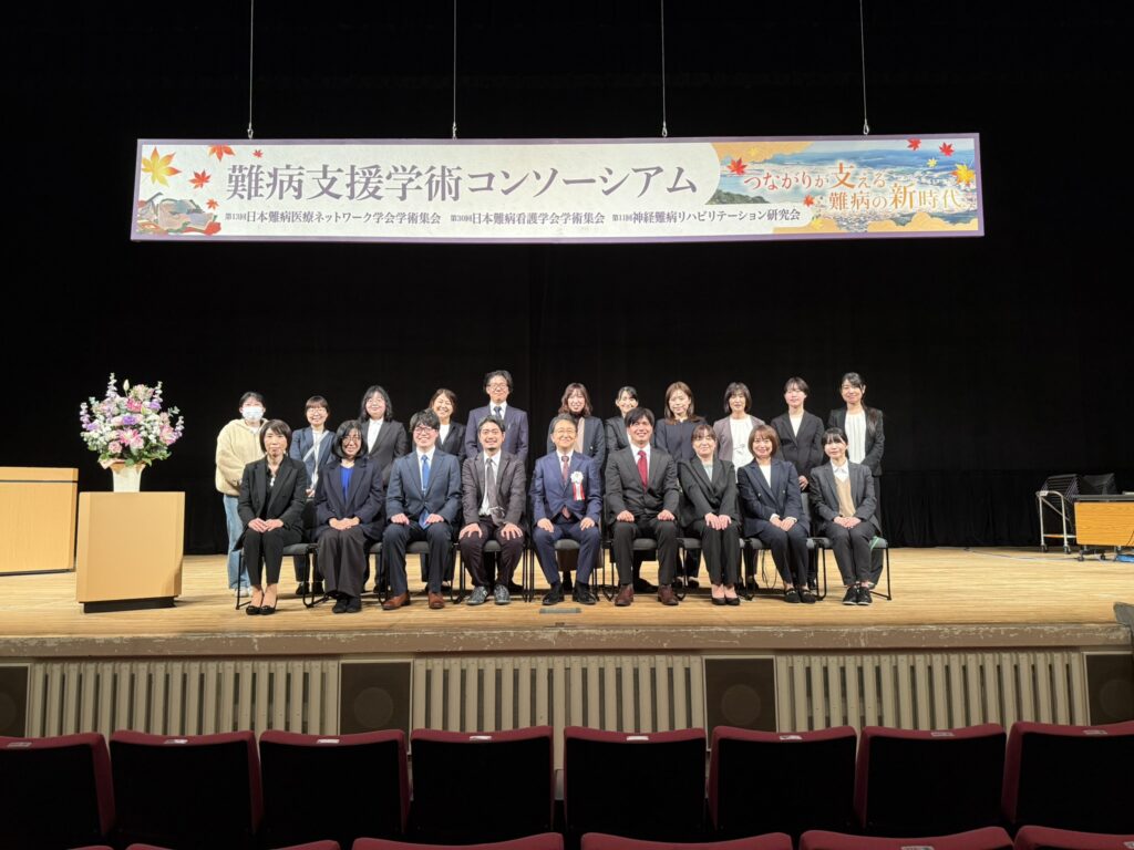 難病診療に関わる3つの学会(日本難病医療ネットワーク学会、日本難病看護学会、神経難病リハビリテーション研究会)による学術合同大会「難病支援学術コンソーシアム」が、11月28日・29日、晴れ渡る琵琶湖畔の大津市民会館にて開催されました。目標の800名を超える1150名もの多職種の方々にご参加いただき、大盛況のうちに閉会することができました。貴重なご講演・ご発表をいただいた演者の皆様、座長やファシリテーターをお務めいただいた皆様、また全国からご参加いただいた皆様に心より感謝申し上げます。本学会での学びが皆様の難病診療やケア、支援につながることを祈念しております。至らぬ点も多々あったかと存じますが、何卒ご容赦ください。(写真は閉会式後の滋賀医大の学会サポートチームの記念撮影です)